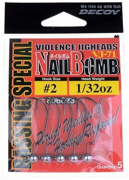 The Decoy Nail Bomb weedless jighead is perfect for fishing in heavy structure where a conventional jighead can not be fished. These work great with jerk minnows and grubs