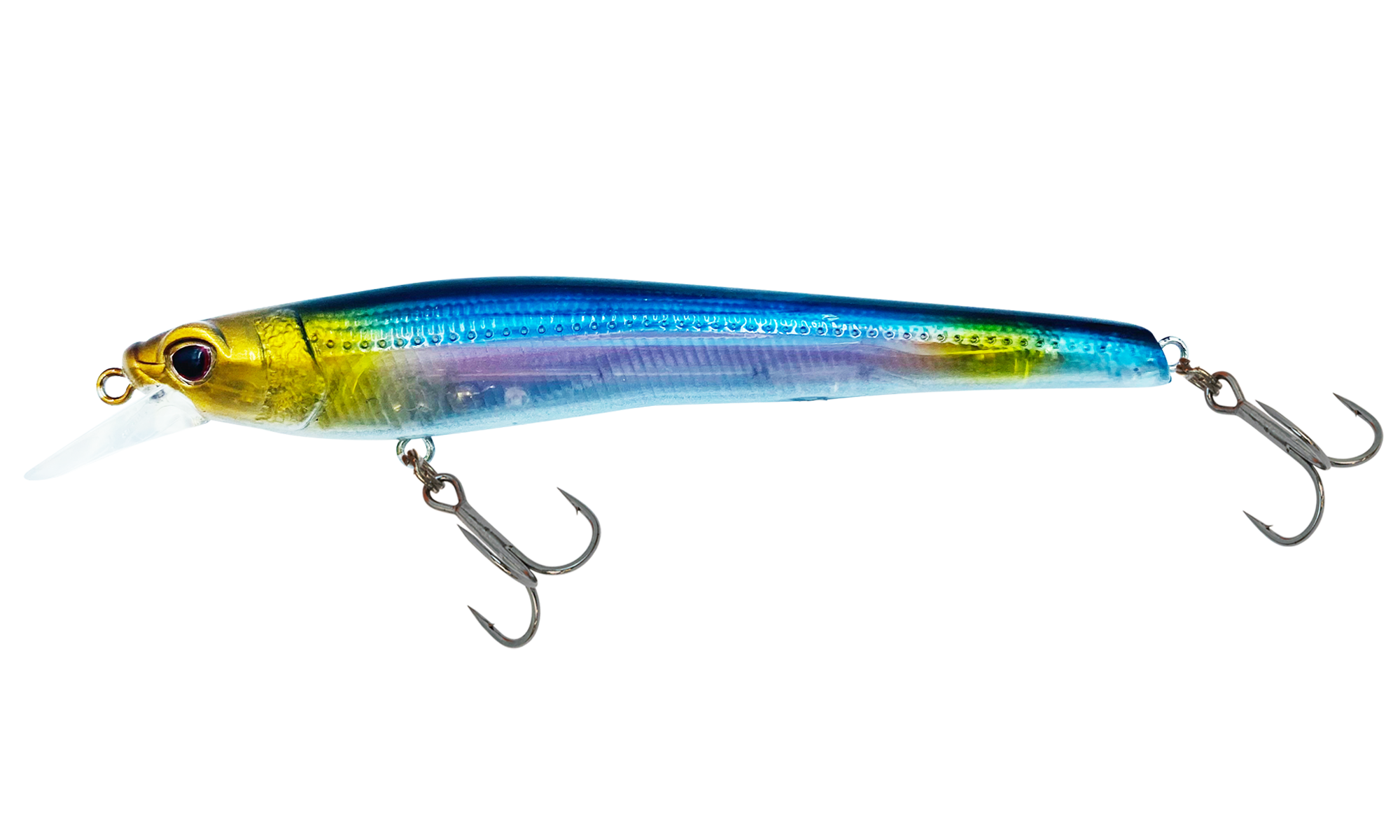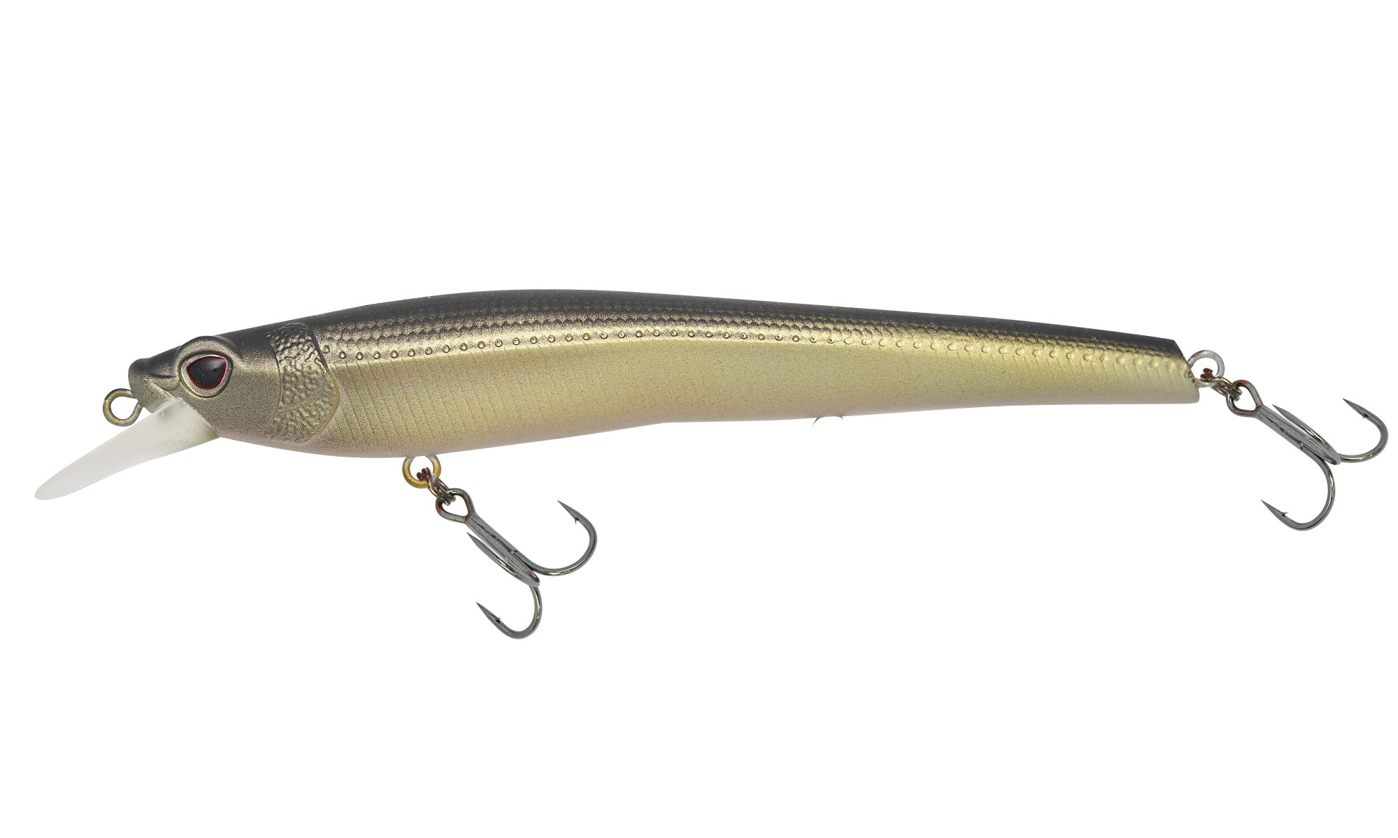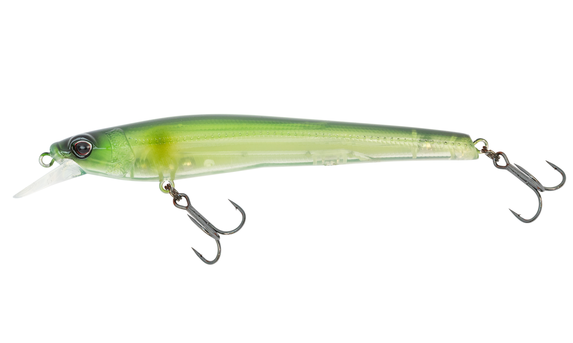 The SHIKARI is a long-casting, shallow diving, slow floating jerkbait with an internal tungsten weight transfer system. The internal weight slides backward into the tail when casting to maximize distance, and then rolls forward when being retrieved to balance the lure and keep it perfectly level.