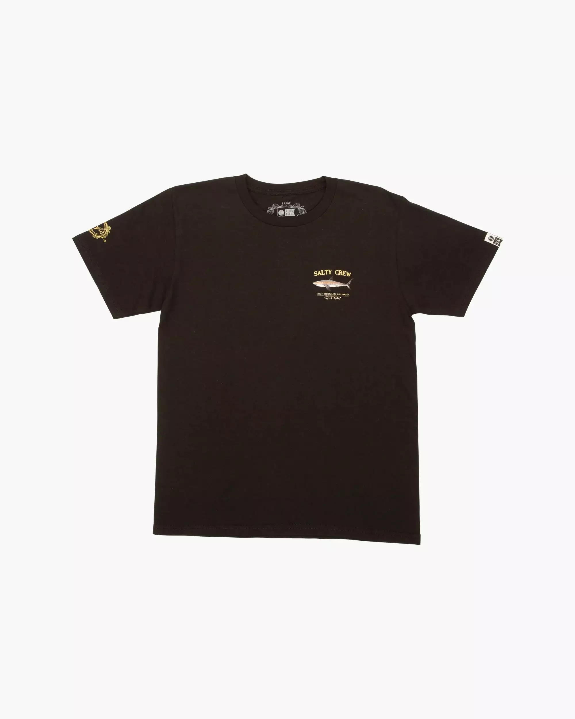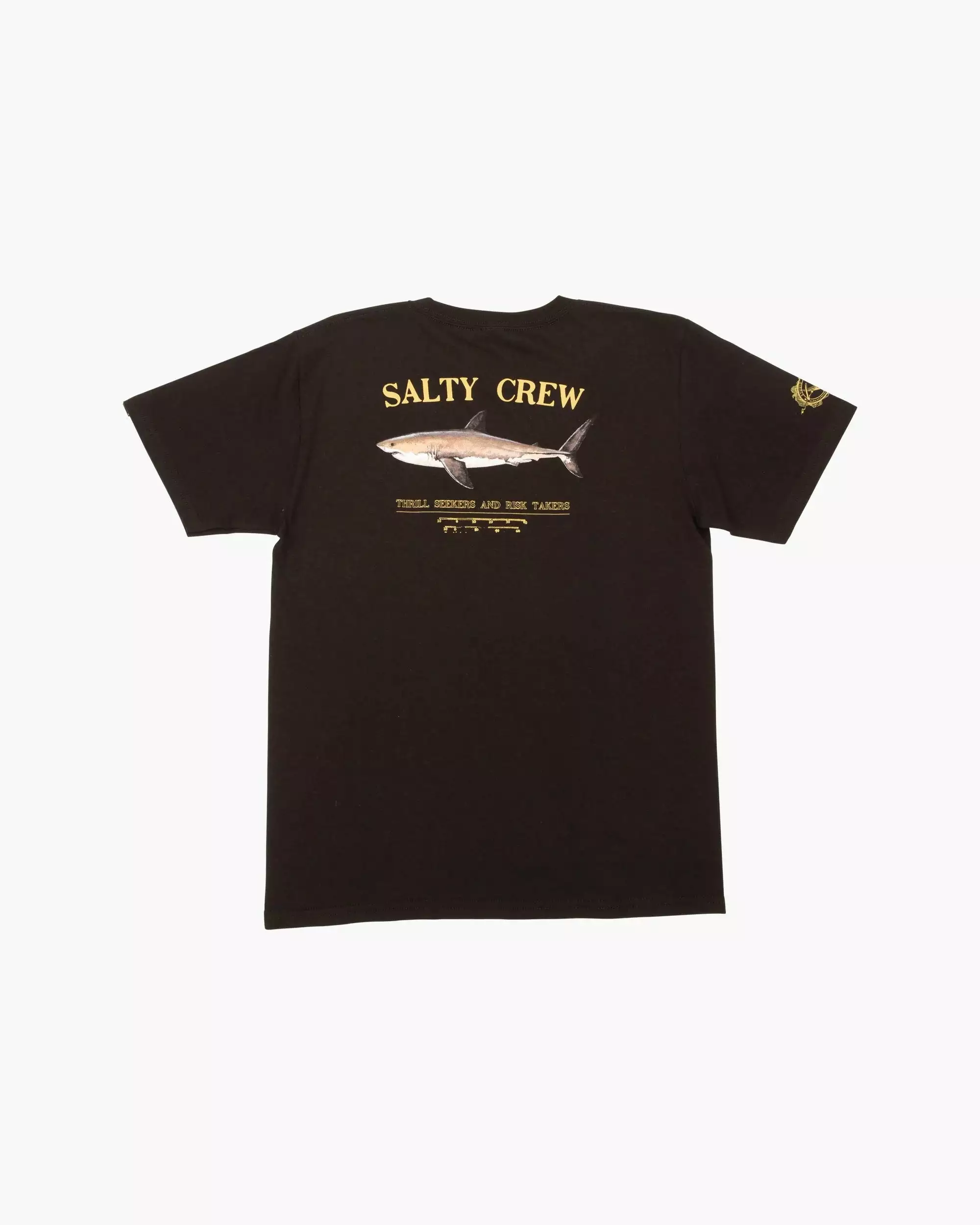 The Bruce S/S Tee in Black is a short sleeve t-shirt with shark design screen printed front and back. Made from 60% cotton and 40% polyester.