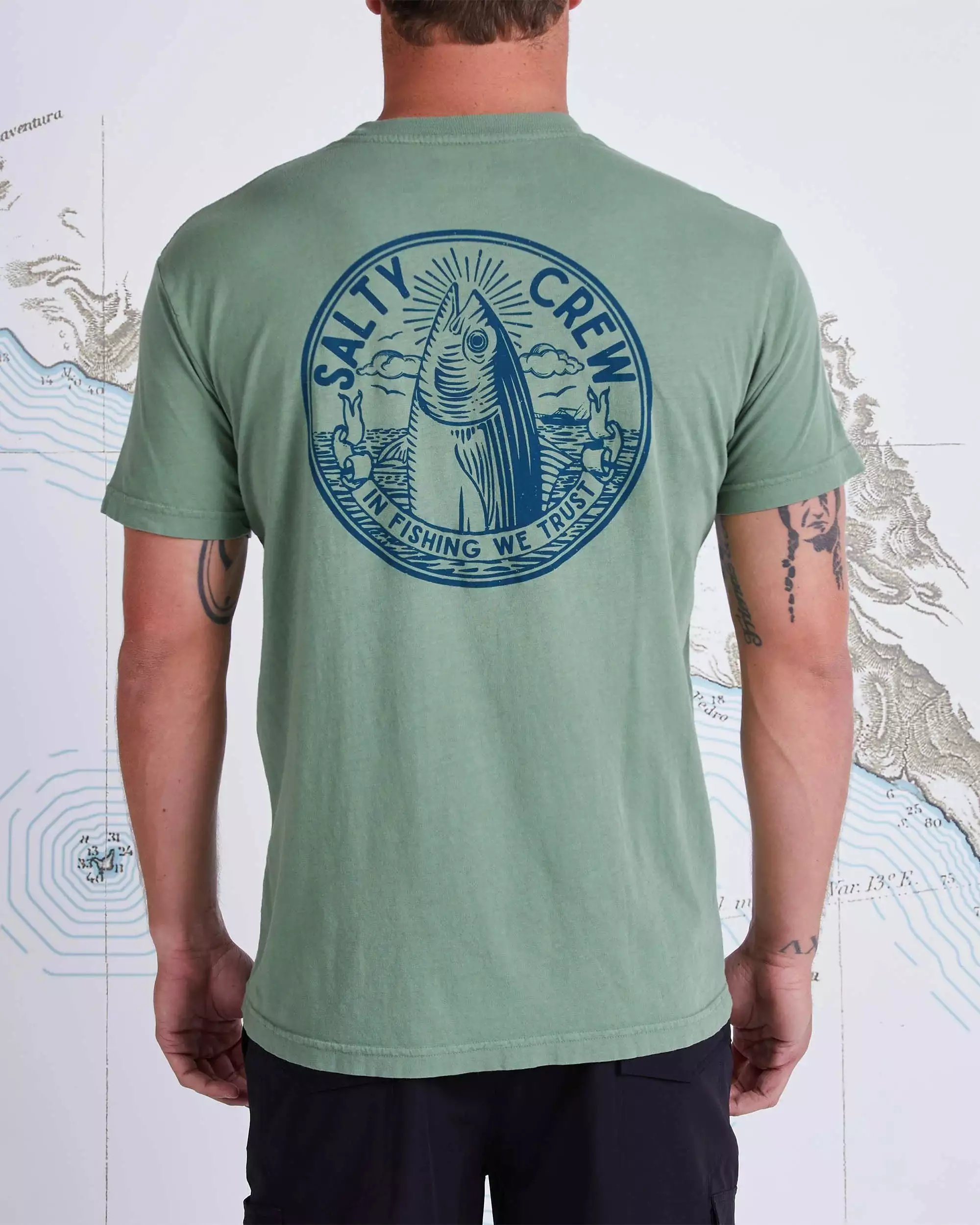 n Fishing We Trust Premium S/S Tee in Sage green. Premium 100% cotton t-shirt. Featuring custom Salty Crew screenprinted front and back.